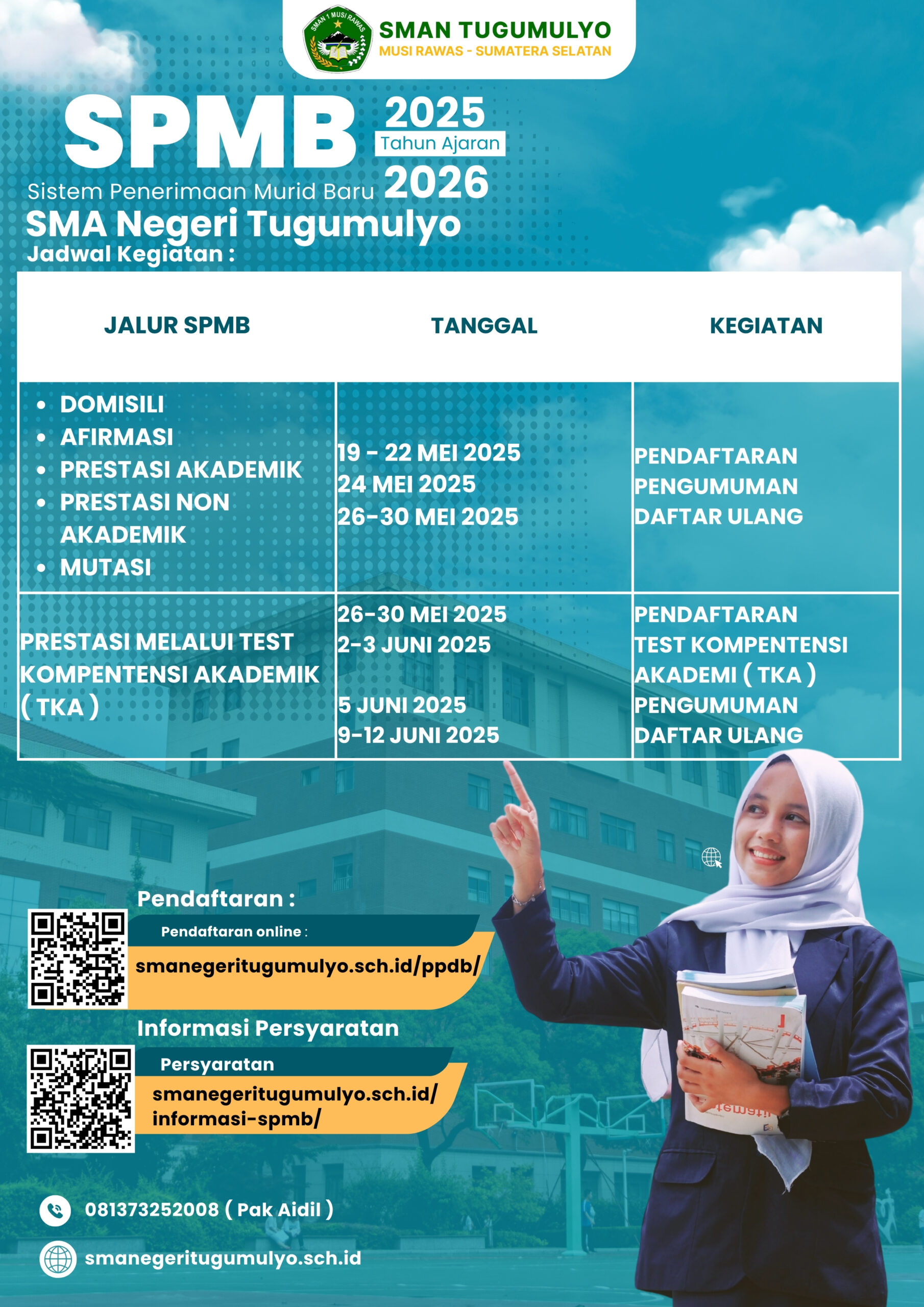 Selamat Datang, SMA Negeri Tugumulyo sebagai salah satu sekolah negeri terbaik di Kabupaten Musi Rawas Provinsi Sumatera Selatan akan menerima calon murid baru melalui Sistem Penerimaan Murid Baru (SPMB) Tahun Ajaran 2025/2026